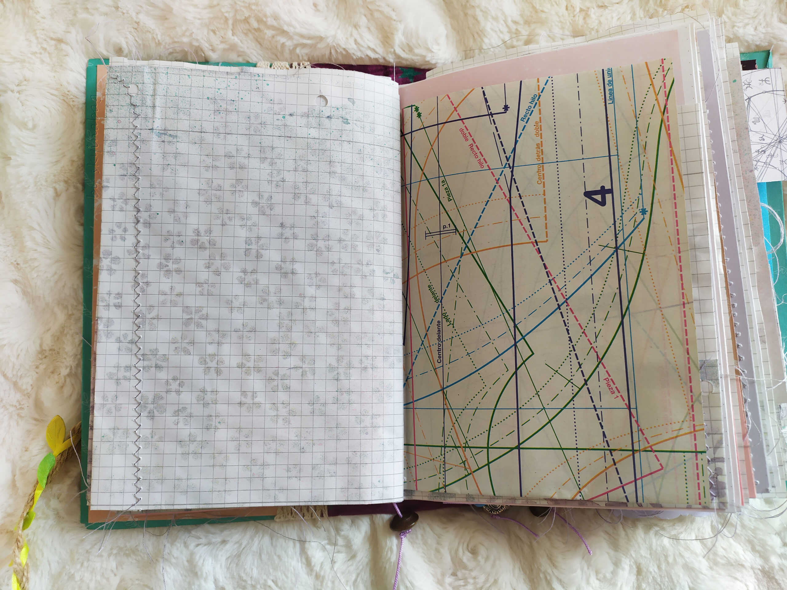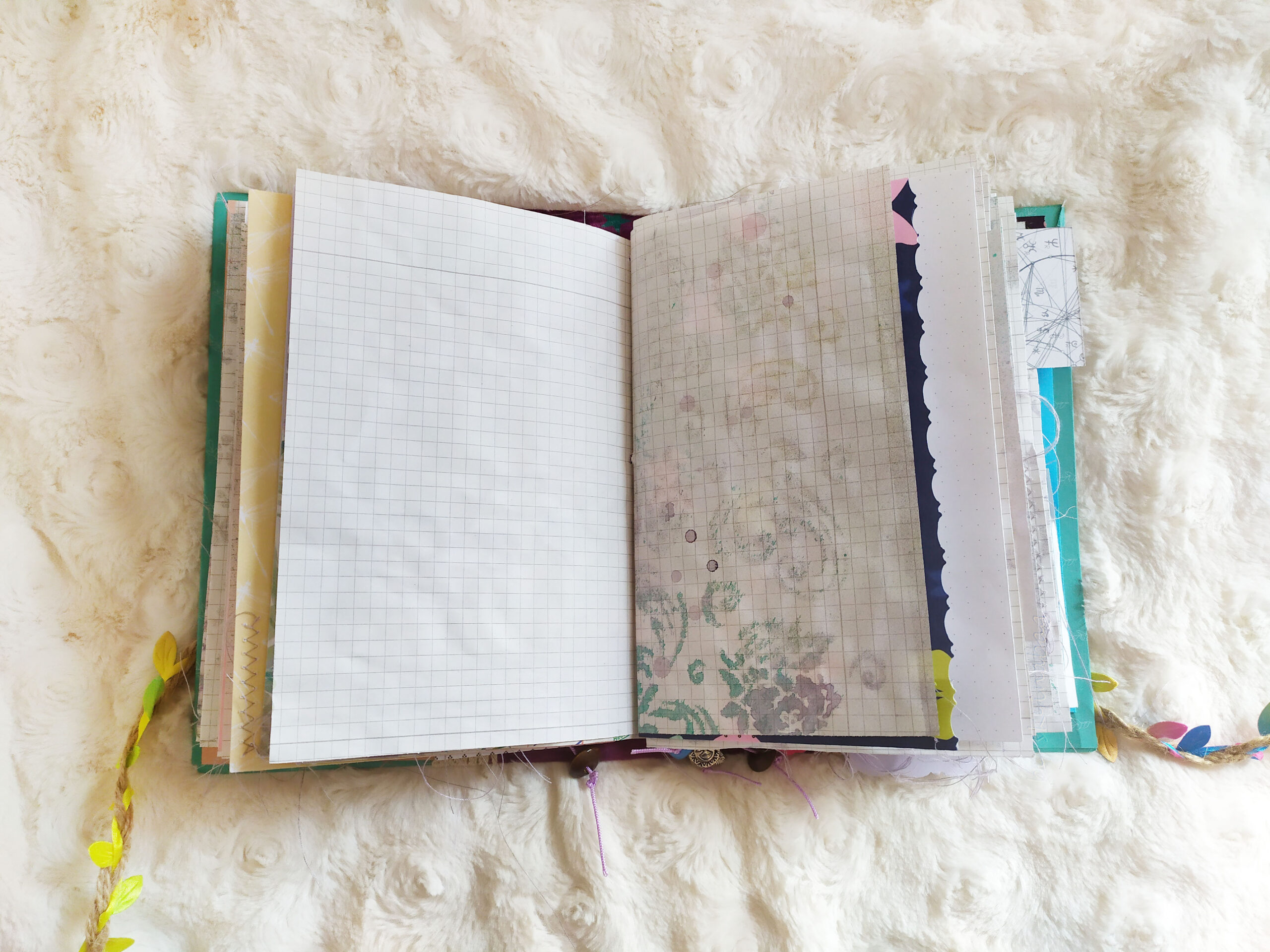 Tak jak wspominałam, przeznaczeniem tego journala było prowadzenie zapisków. Oczywiście nic nie stoi na przeszkodzie, żeby sklecić taki zeszyt ze zwykłych pustych kartek. Myślę, że już sam koncept z różnymi stronami obok siebie (linie, kratka, kropki) byłby ciekawy. Jednak tutaj miało być też kolorowo i po prostu ładnie.