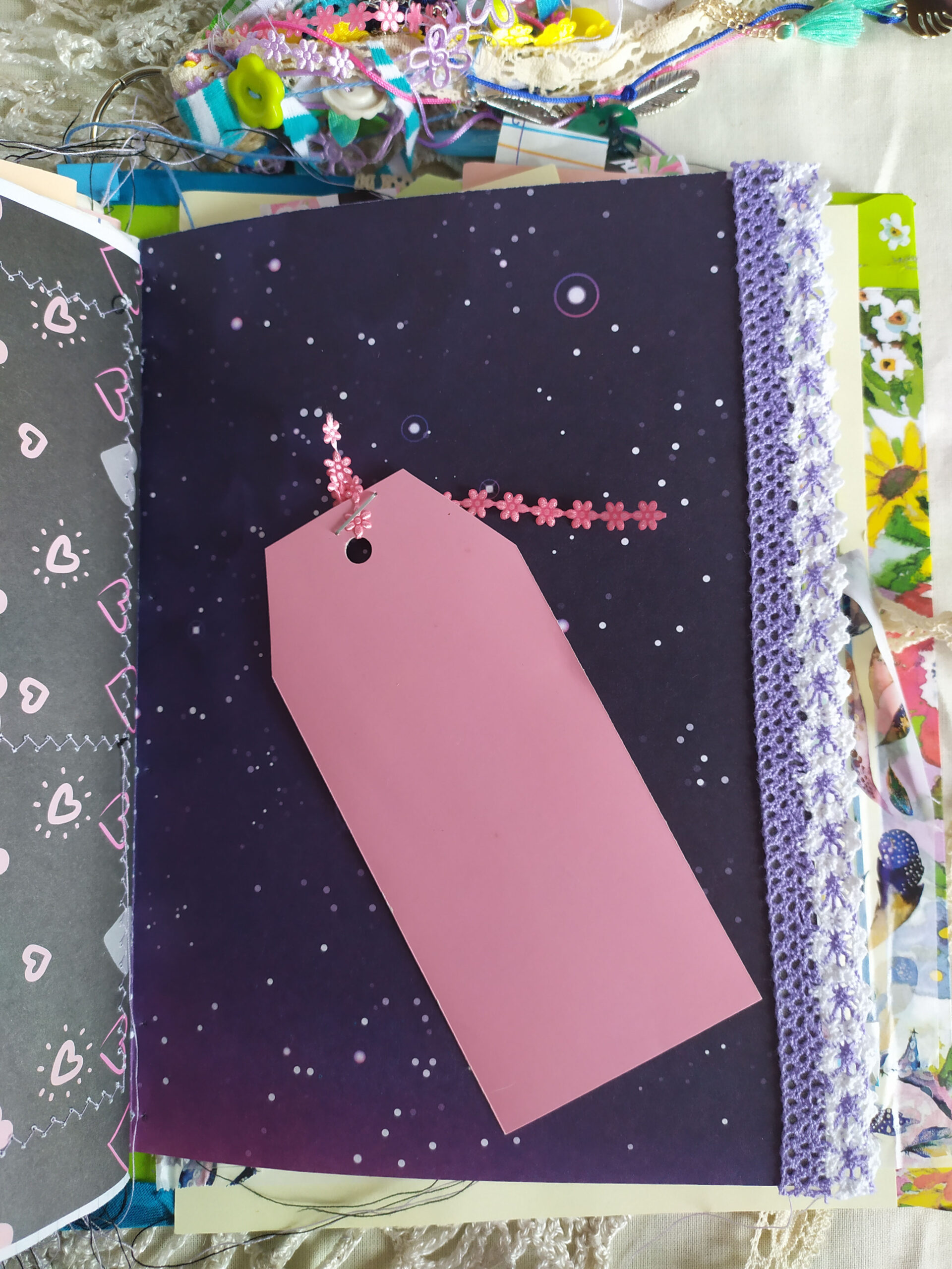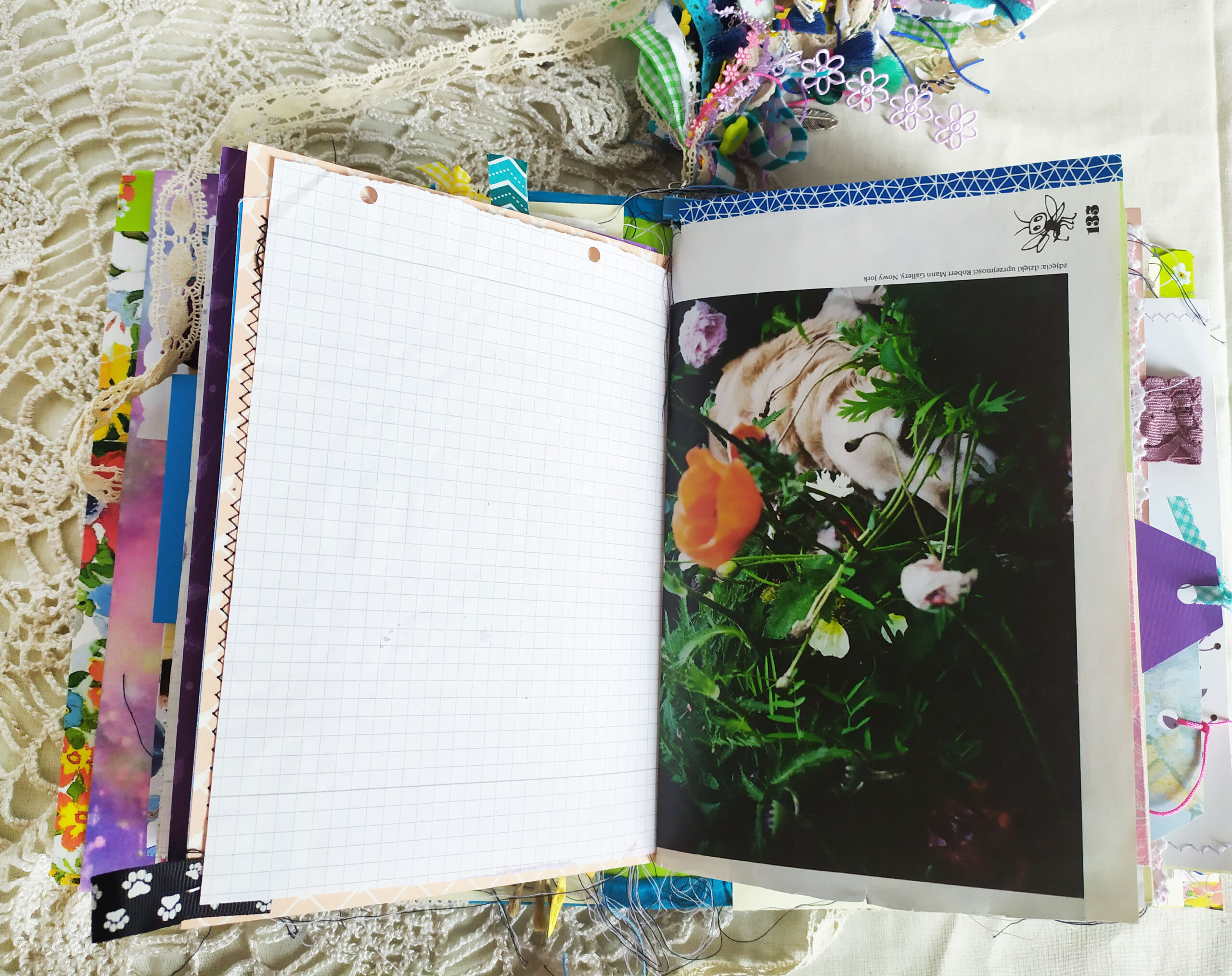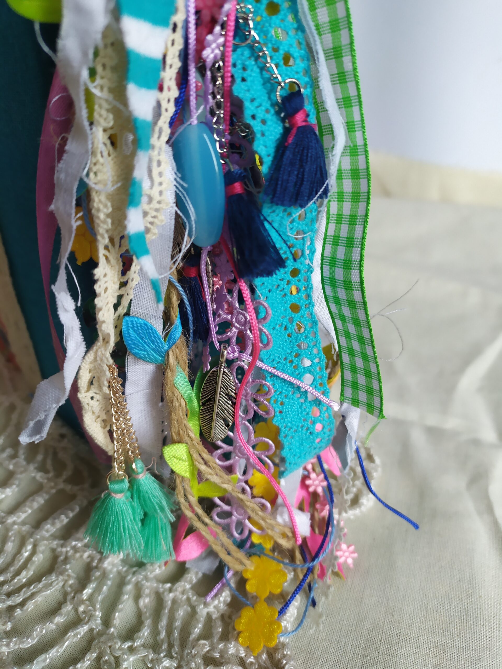 Możliwości dodatkowego upiększenia junk journala są praktycznie nieskończone. Jednym z popularniejszych jest tzw. ogon, czyli chwost, przymocowany do grzbietu zeszyciska. Składa się ze sznurków lub tasiemek, zwykle ma zamocowane jakieś koraliki, guziki lub elementy biżuterii. Trochę tutaj z tym popłynęłam, no ale jak wypas to wypas 😉