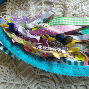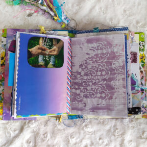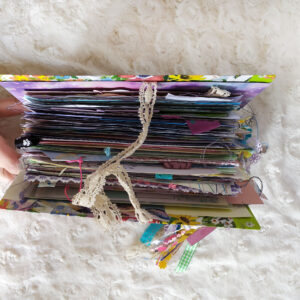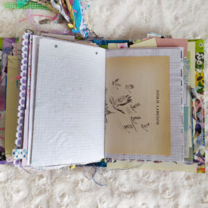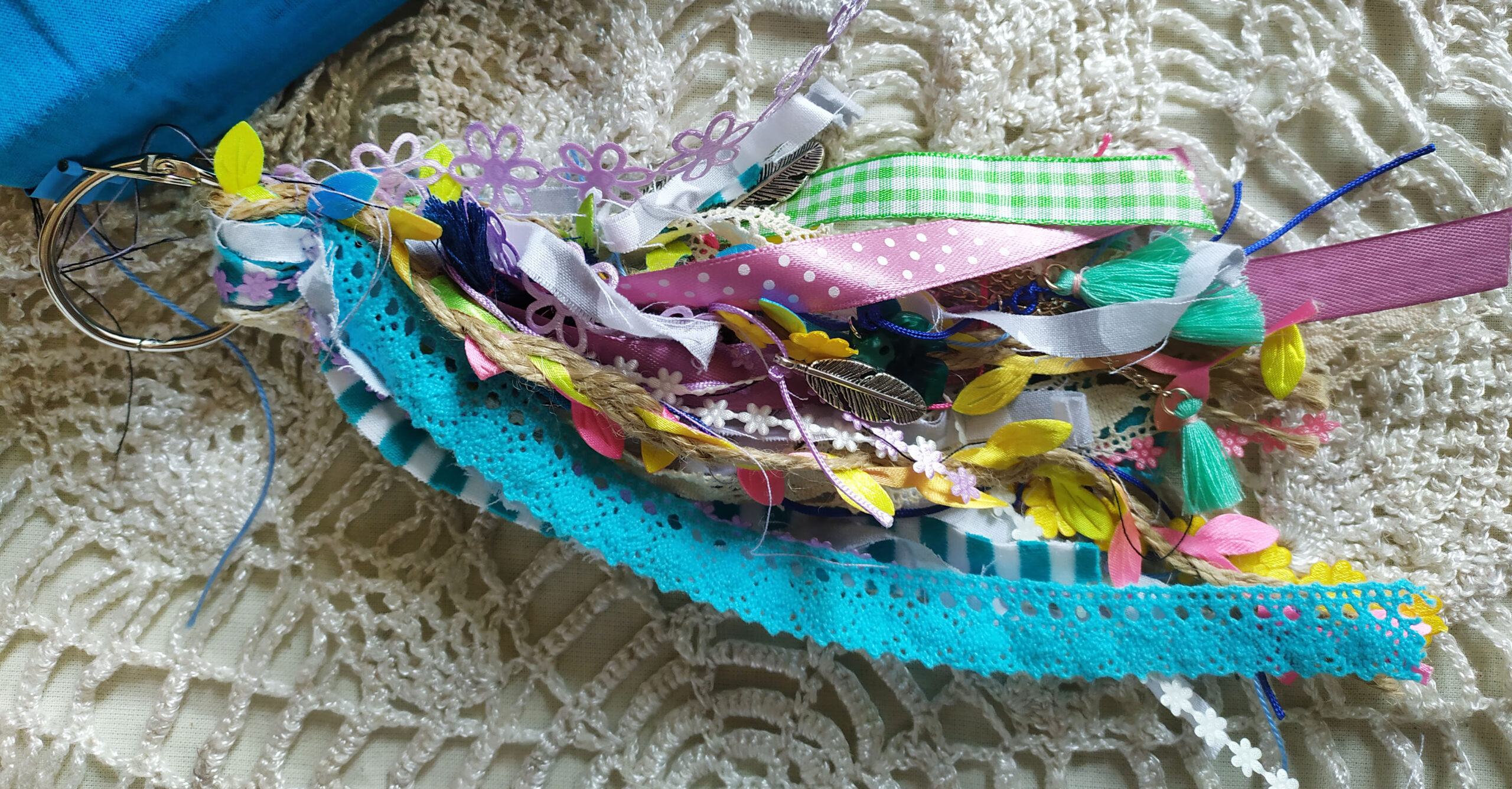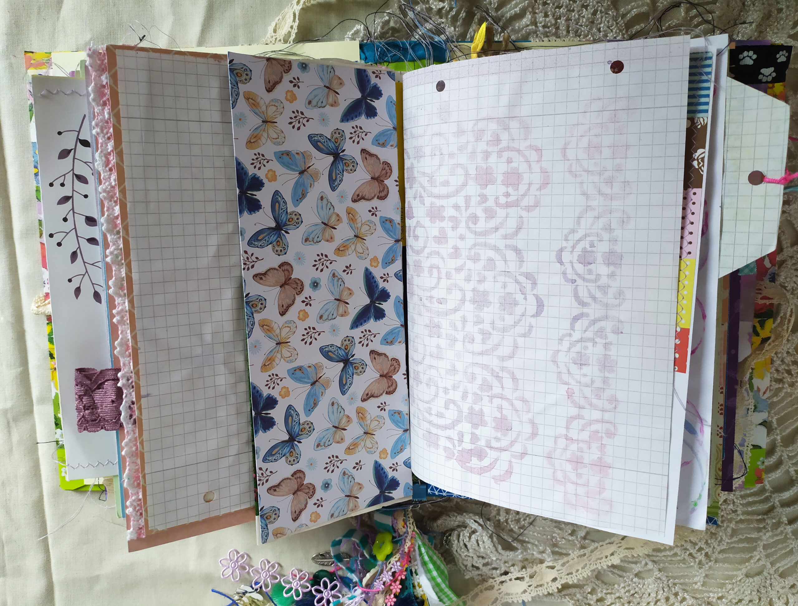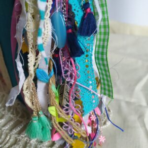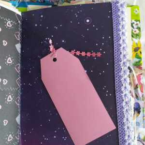 Możliwości dodatkowego upiększenia junk journala są praktycznie nieskończone. Jednym z popularniejszych jest tzw. ogon, czyli chwost, przymocowany do grzbietu zeszyciska. Składa się ze sznurków lub tasiemek, zwykle ma zamocowane jakieś koraliki, guziki lub elementy biżuterii. Trochę tutaj z tym popłynęłam, no ale jak wypas to wypas 😉