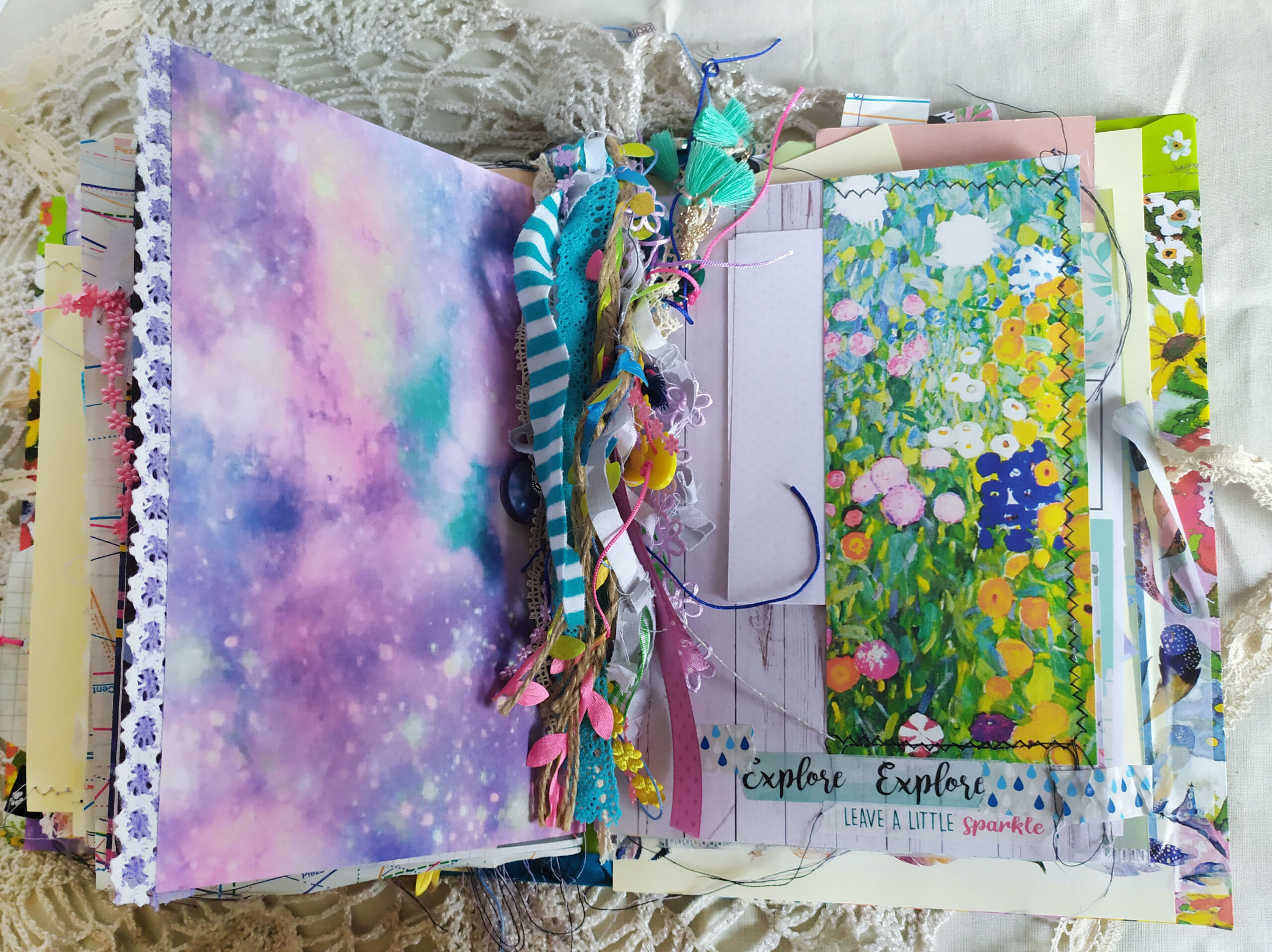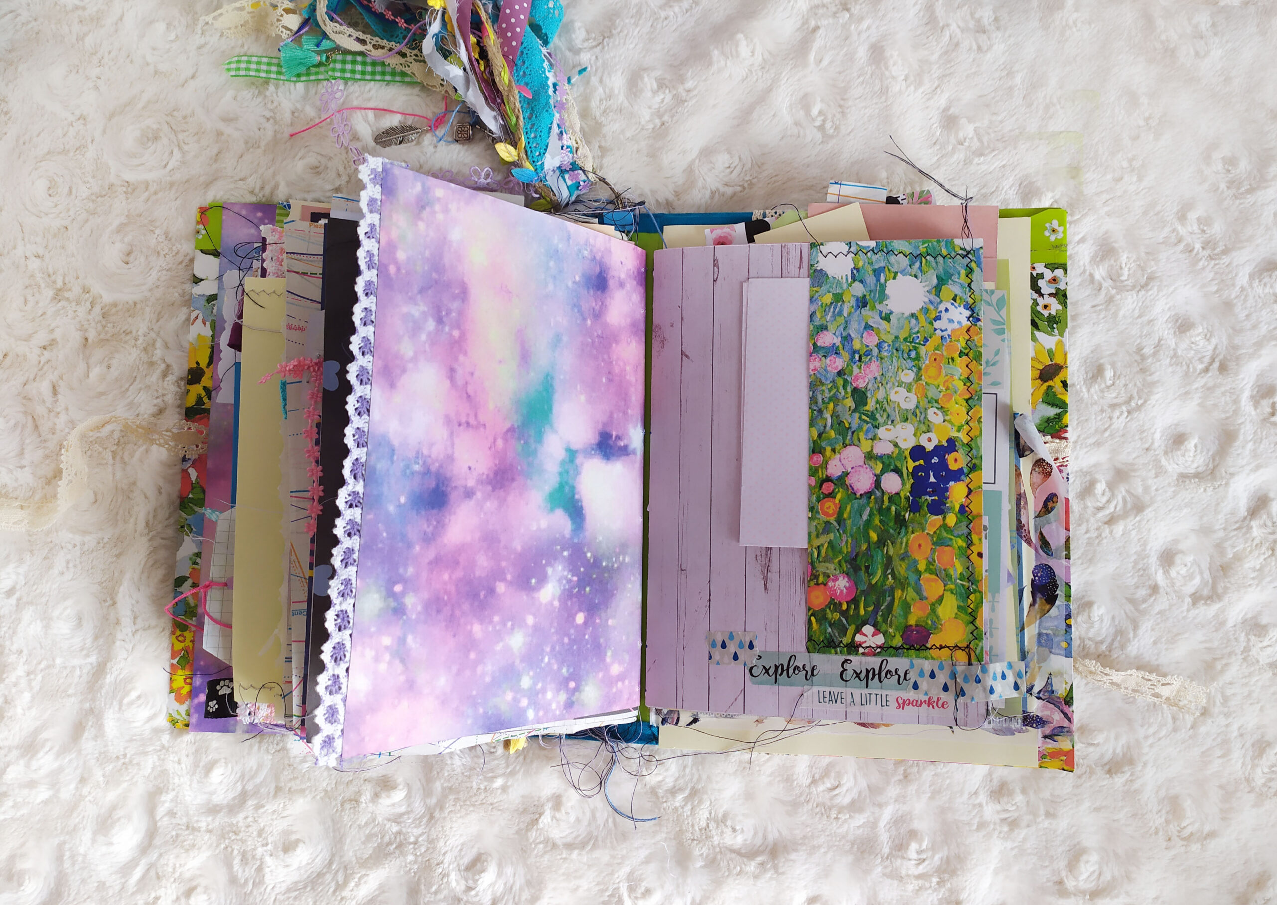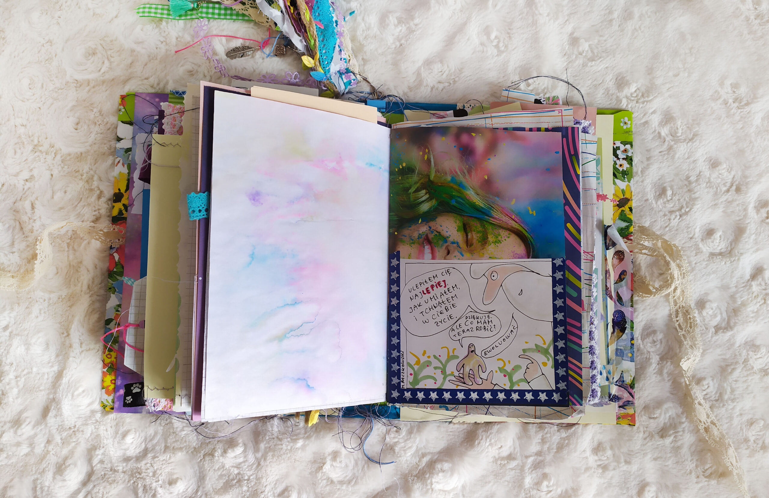 Ten junk journal był prezentem dla dziewczyny uwielbiającej kolory, pozytywny przekaz i rozwój osobisty, kochającej psiaki. Kwiaty, motyle i szeroka paleta barw były motywem przewodnim w tworzeniu tego kawałka książki, a wzbogacone zostały odrobiną gwiazd i kosmosu. Nie wahałam się w użyciu gotowych papierów do scrapbookingu, ale spokojnie, twórczego przetworzenia „śmieci” też nie zabrakło. Chcesz poznać szczegóły?
