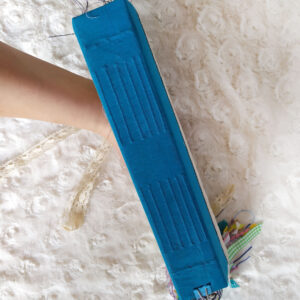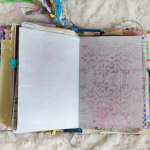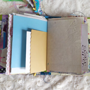 Zacznijmy tak typowo, czyli od okładki. Baza została zrobiona z tylnej okładki bloku i oprawiona w przepiękny papier z torebki na prezenty. Potem wszyłam sygnatury (TU dowiesz się czym są). Grzbiet okleiłam kawałkiem tkaniny po… t-shircie. Łączenie zamaskowałam tasiemką koronką. Przykleiłam ją na taśmę dwustronną. Wszystko kleiłam na klej magiczny, który po nałożeniu dobrze jest rozsmarować pędzelkiem.