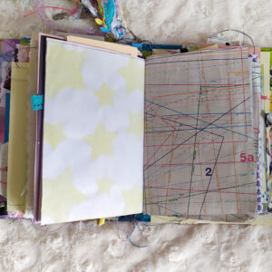 Czas zajrzeć do środka. Poza gotowym papierem użyłam jeszcze wielu interesujących „śmieci”. Były to: strony z gazet, plamiony własnoręcznie sprayami papier, koperty i torebki, strony i ilustracje z książek, a nawet wykroje. A jedną z większych przyjemności w tworzeniu takich zeszytów jest zestawienie tego wszystkiego razem tak, by pasowało i dawało tą zajebistą nową/starą jakość jaką mają junk journale właśnie. Całość doprawiona taśmami washi i stemplami.